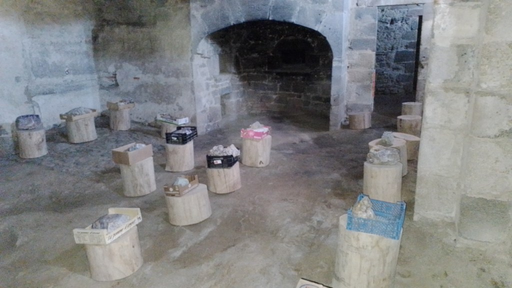 Les échantillons sont présentés sur des rondins de hêtre polis. Et, un éclairage spot aux LED permet de bien mettre en valeur les échantillons dans l’ambiance souterraine des caves.
