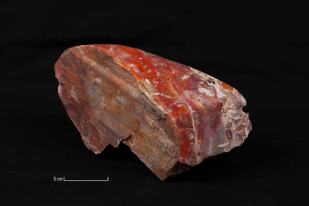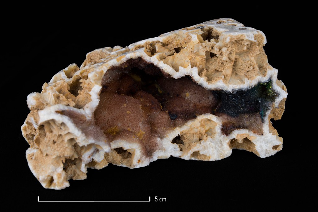Calcédoine et géode de quartz à fin dépôt irisé d’hématite, Céaux d’AllègreMiroir de faille, calcédoine rouge, brèche de calcédoine et barytine, Tapon/Saint-Ilpize