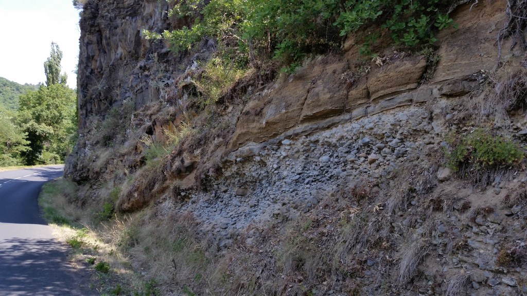 Alluvions de gallet et sable du Villafranchien (Pléistocène) recouvert de maar fin puis de basalte, La Girondie/Blassac