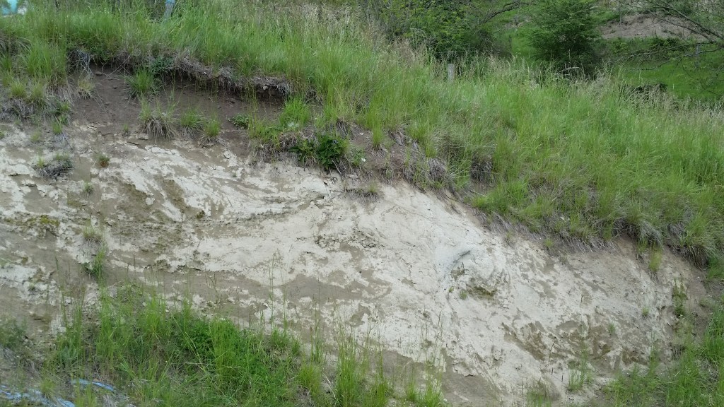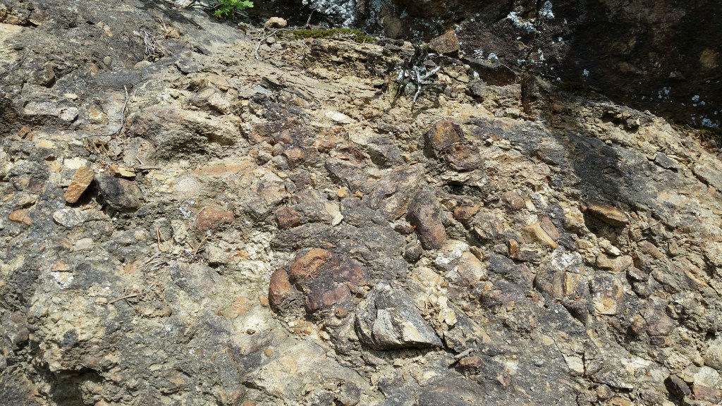 Fin niveau de paléosol ocre entre 2 formations, au-dessus des scories basaltiques et en-dessous du gneiss fragmenté, Achaud/Aubazat